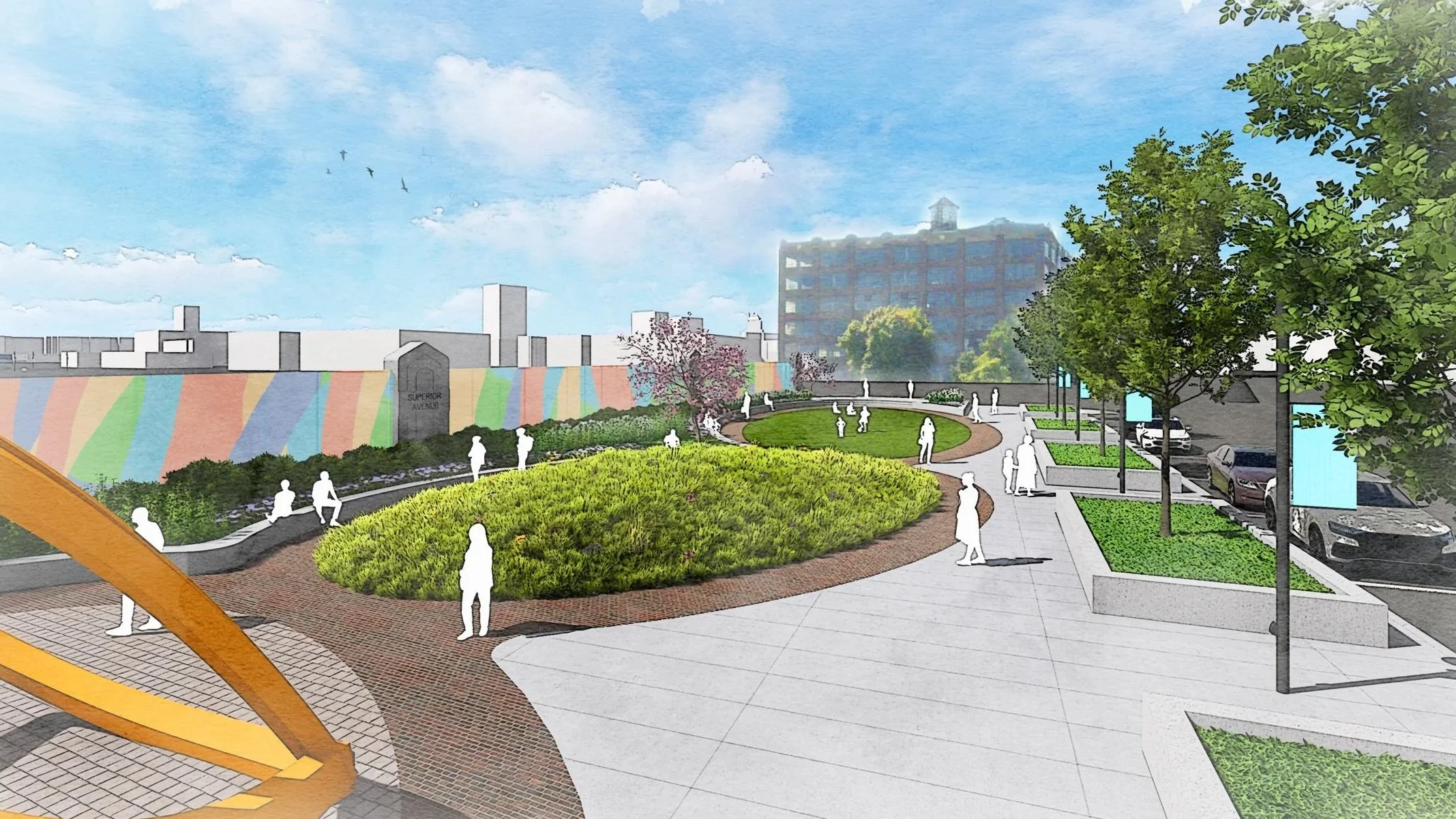 The master plan prioritizes enhancing multimodal connectivity and revitalizing the public realm. Initiatives are focused on supporting small businesses, consolidating surface parking lots for future development, and implementing public art programs that will revitalize streetscapes and define new gateways at the eastern and western edges of the district. The ultimate goal is to create a well-connected and economically strong Campus District that celebrates its significant history while establishing itself as an iconic destination for residents and visitors of Downtown Cleveland.