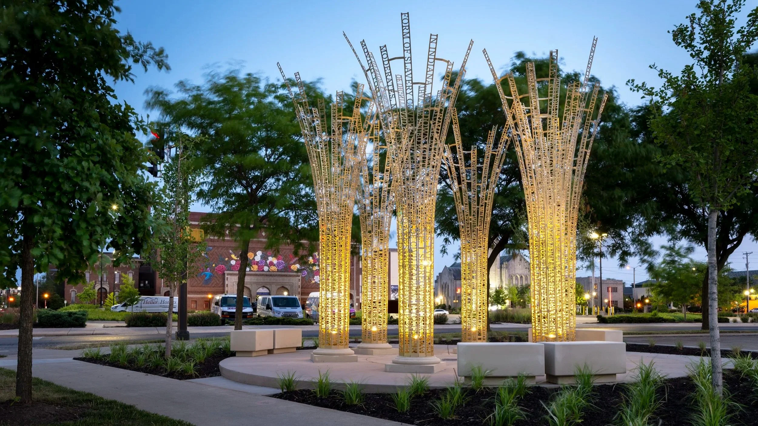 Designed by Shane Albritton and Norman Lee, “Pillars of Hope and Justice” stands on the corner of Ewing and Main Streets celebrating Dr. King;s visit to Fort Wayne and the words he spoke there on his way to Washington DC for the infamous "I Have a Dream Speech". The monument features the six pillars of nonviolent resistance, evoking both ancient architectural pillars and reeds of papyrus, bringing together ancient and contemporary.